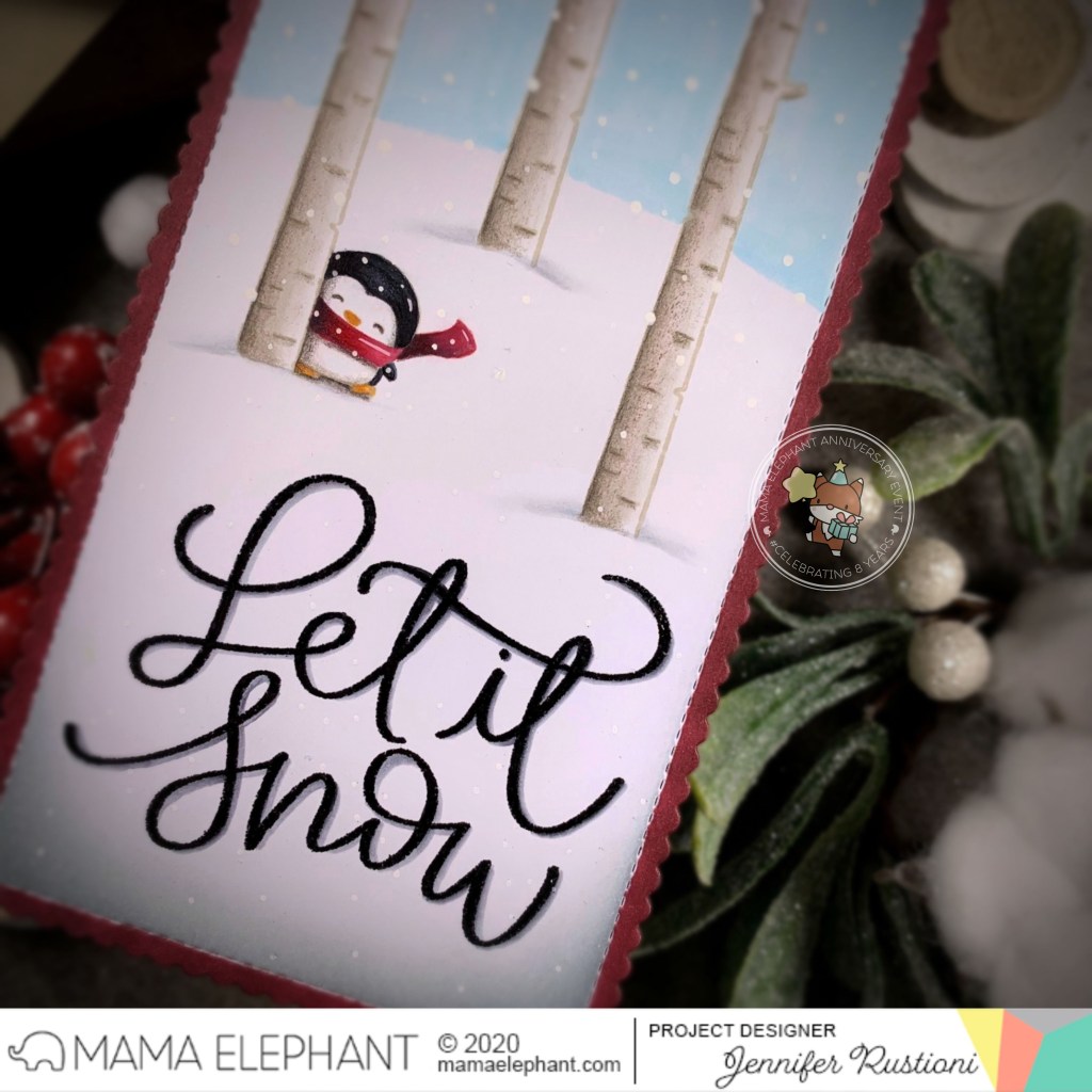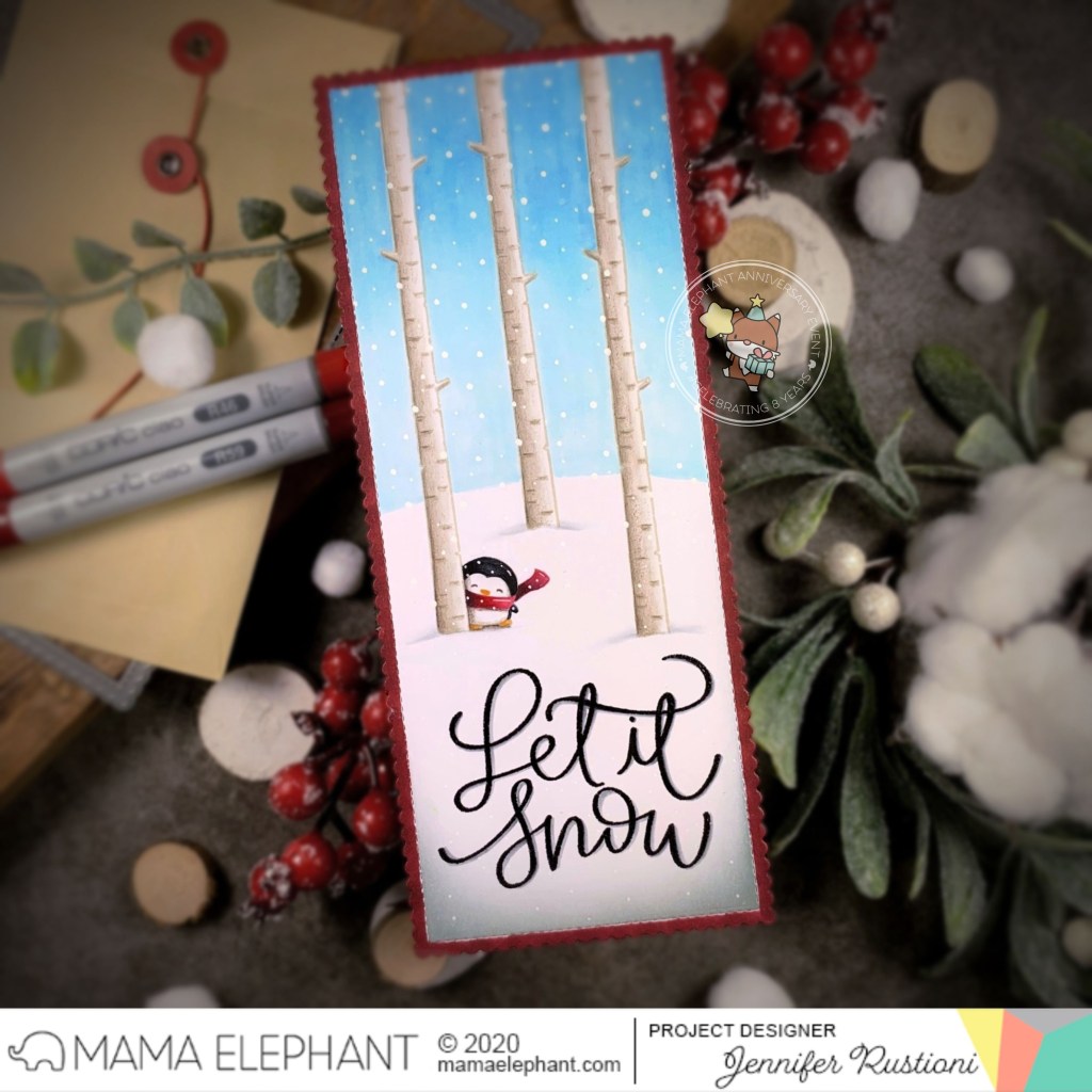 For this slimline card I used the “Slim Window Dressing” Creative Cuts, and I created a scene of a magic winter wood. I stamped the trees and the little penguin using the Distress Oxide Pumice Stone to have a no-line effect and then I coloured my scene with the Copic markers. At last I embossed the beautiful “Let It Snow” sentiment. I added the shadows to my sentiment to create a 3D effect.