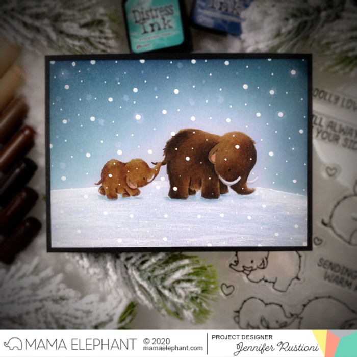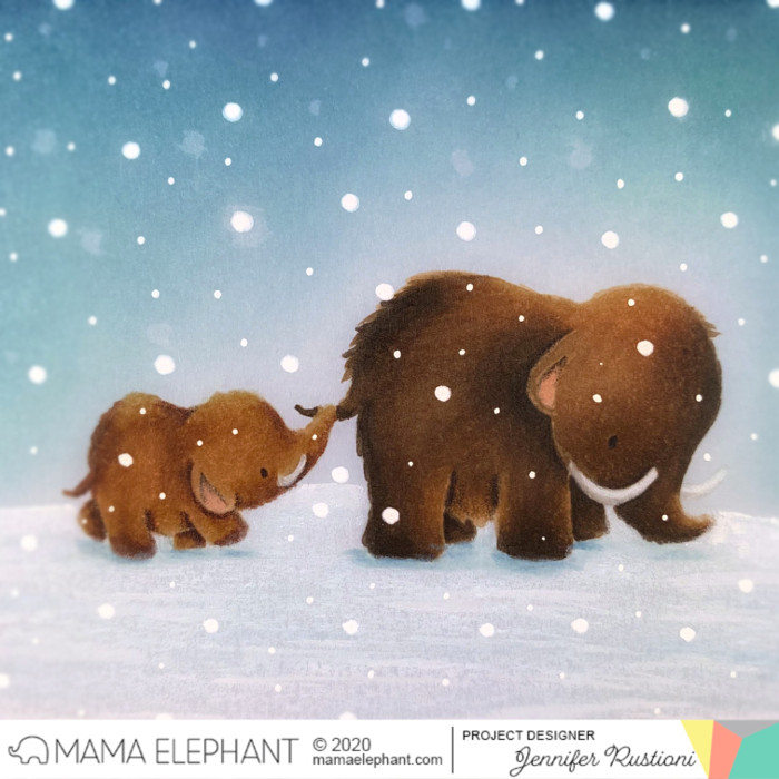 Hi everyone! Jennifer here today with a scene card featuring the amazing Mammoth Love stamp set. These mammoths are so sweet and perfect to create so many type of cards! As usual I have chosen to create an illustrated card and I set my scene in the Ice Age.