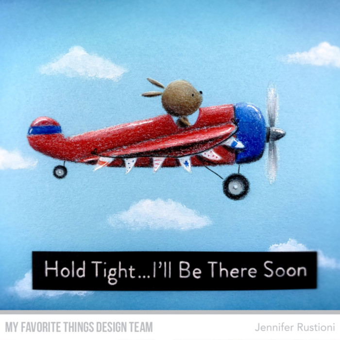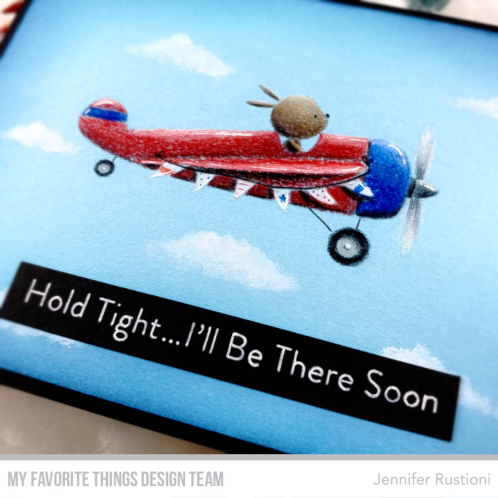 For my project I stamped the bunny on the airplane on the MFT Sno Cone Card Stock, to already have the blue sky of my background. I colored it with Prismacolor Pencils and then I added some details with a fine piont black pen and with a white gel pen. I lightly blended the edges with Distress Ink Faded Jeans. After that I created some clouds using a white acrylic paint with a cotton swab. At last I added a sentiment on a black banner.