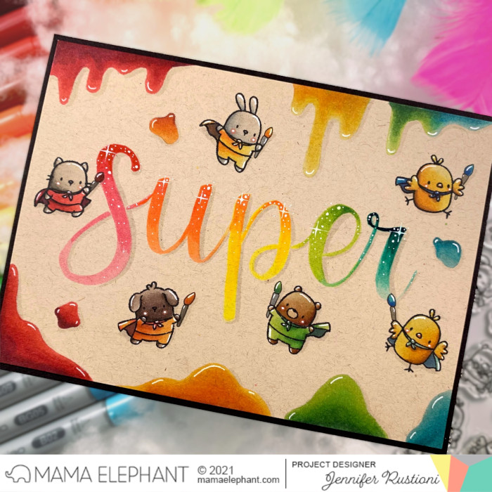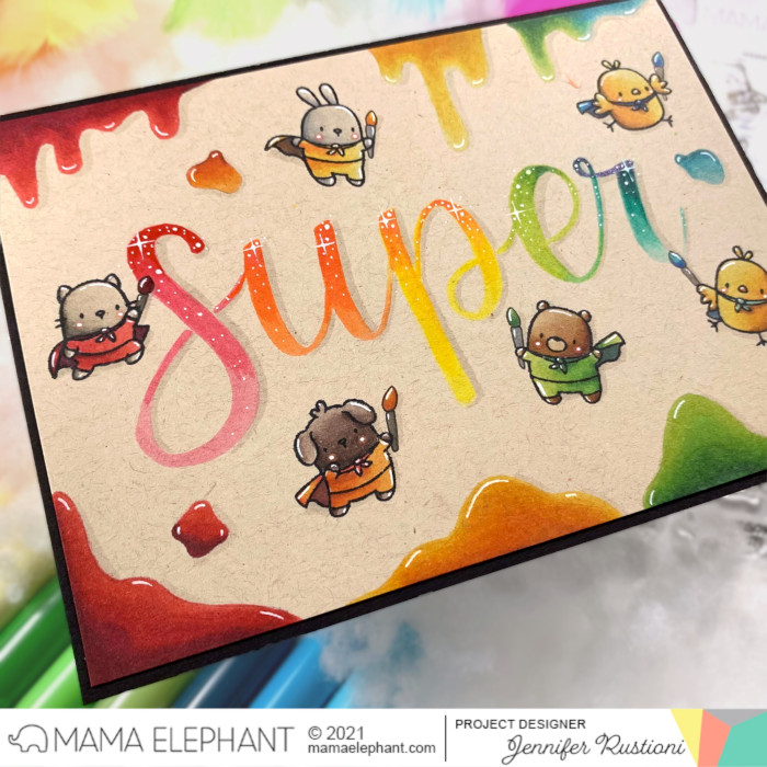 I had fun playing with these super cute creautres and I figured them as Superheros of colors! I started writing the word in the middle of the card using Zig Brushables Markers and I chose having a rainbow effect mixing different colors.