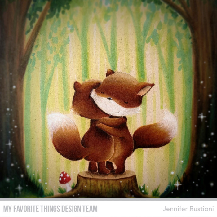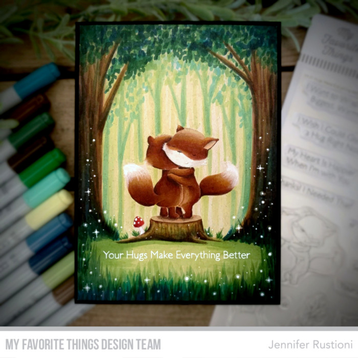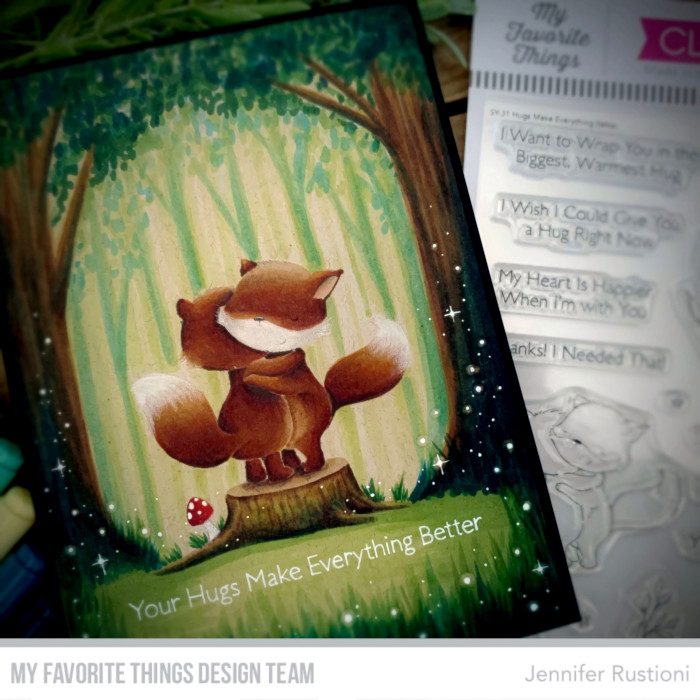 Today I created a card feauturing the new amazing MFT Hugs Make Everything Better stamp set., designed by Stacey Yacula. I really love these beautiful critters! They are so sweet and cute and they are perfect to create scene cards or CAS cards as well.