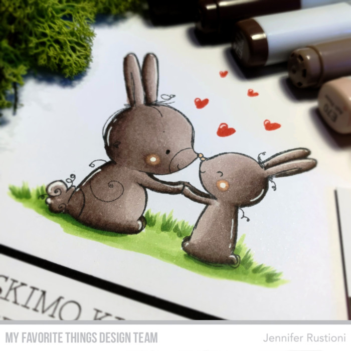I colored the bunnies with Copic Markers and I added just a little of grass and some hearts to have a design perfect for a CAS card. I created some highlights with a white gel pen.