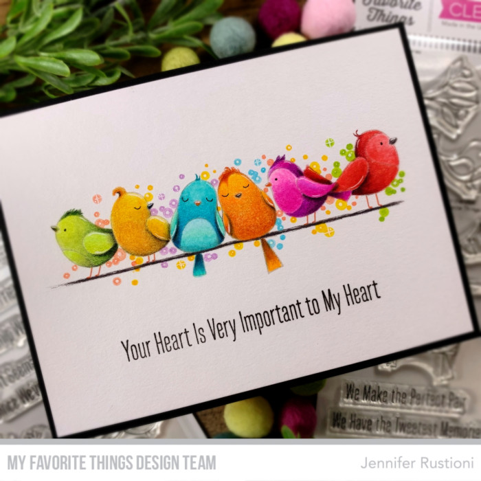For my project I stamped some birds form both sets, using Distress Oxide Pumice Stone to have a soft effect. I had fun coloring them with Prismacolor pencils and I chose to use bright colors to have a very cheerful effect for my card!