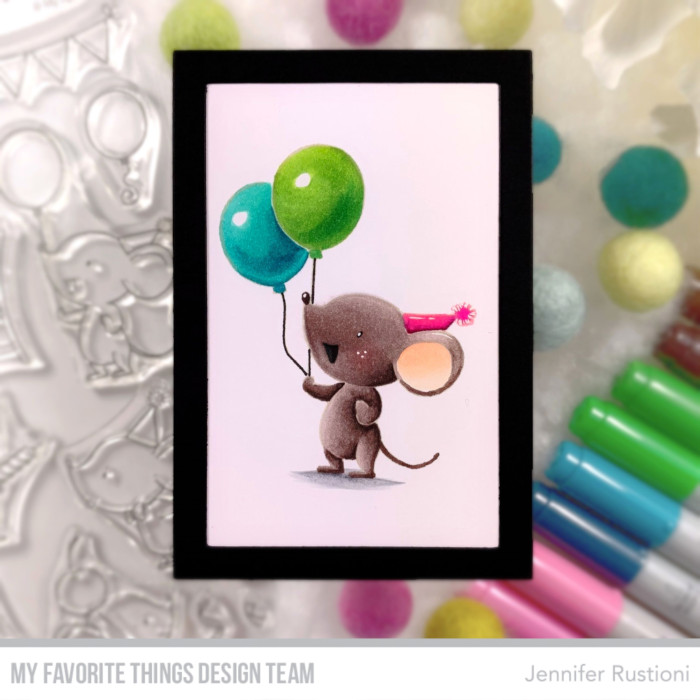 I created a very simple no-line coloring using the beautiful MFT Mice Day To Celebrate stamp set. I stamped the image using MFT Natural Hybrid Ink Pad on the MFT No-Line Coloring Card Stock which is perfect for coloring with Copic Markers. At last I added a black frame to my card, using the MFT A2 Rectangle Frames Die-namics.