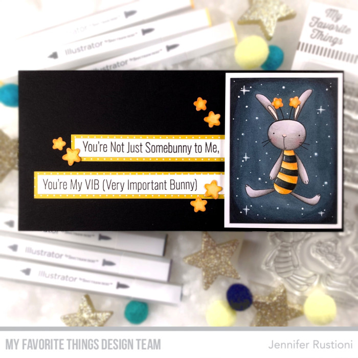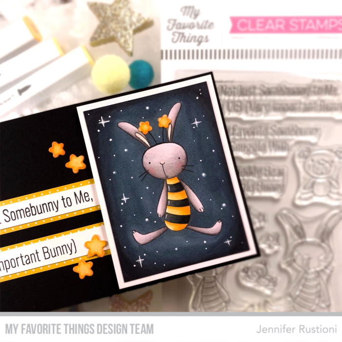 I created a CAS card on a black card sotck, with a small coloring on the right. I used the super sweet MFT Favorite Somebunny stamp set and the coordinate MFT Favorite Somebunny Die-namics. I colored my small scene using Spectrum Noir Illustrator Markers and I had fun to dress my bunny with a bee suit 🙂