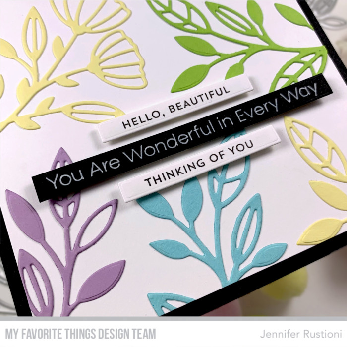 For my project I used the beautiful MFT IN-Focus Floral Die-namics to create a delicate background. I die cut the leaves and the flowers on some card stock in delicate shades. I glued them on the white card stock base and then I added three banner with sentiments from MFT Friends Like You and MFT Itty Bitty Basics stamp sets.
