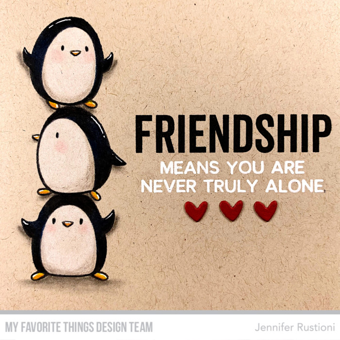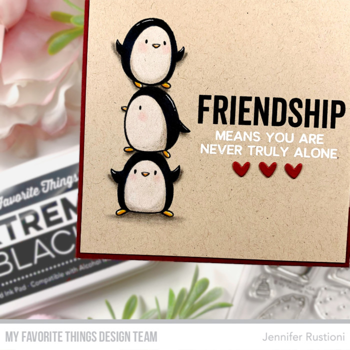 For my project I used three super fun penguins from MFT Polar Opposites stamp set. I stamped my critters with MFT Extreme Black Hybrid Ink and I put them one on the top of the other, making a little masking. I colored the penguins using Prismacolor pencils and then I added the shadows using Carbothello Pastel Pencils. I created some highlights with a white gel pen and then I stamped the sentiment from the MFT What Friendship Means stamp set (how beautiful is this stamp set???). At last I glued three small red hearts that I die cut from the MFT Love Speech Bubbles Die-namics.