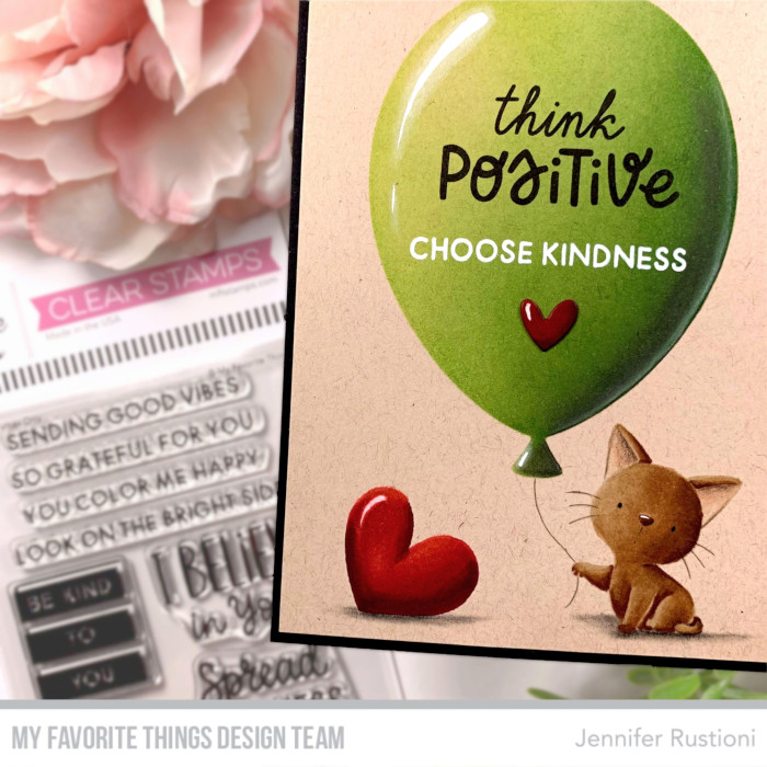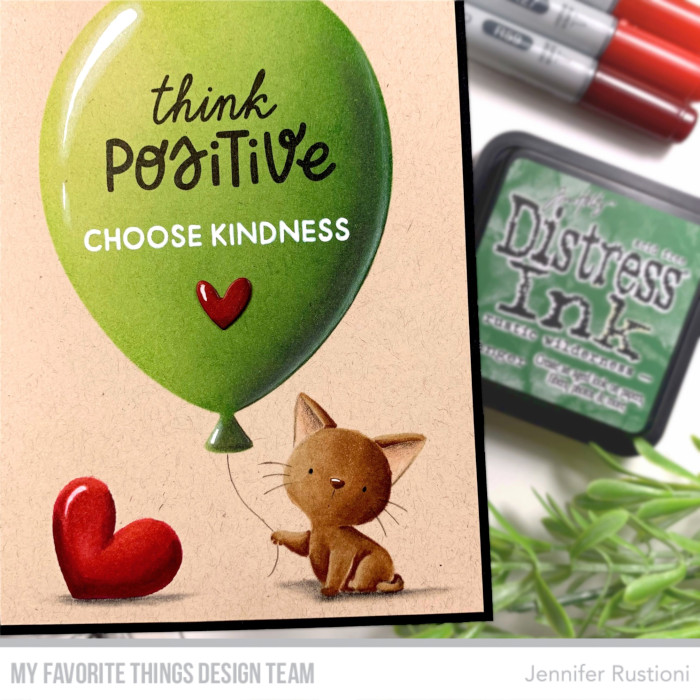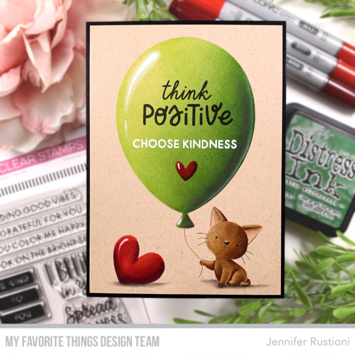 I created a CAS card with a little cute cat holding a big balloon, which is the protagonist of my project. I realized the balloon using the MFT Big Balloon Premium Stencil and I colored it blending Distress Inks. Then I stamped the cat from the MFT BB Cat-astrophe stamp set with the MFT Natural Hybrid Ink Pad to have a no-line effect and I colored it with Copic markers. After that, I drew a heart on the left of my card and I colored it with Copic markers as well. At last I stamped the sentiments in the middle of the balloon from the MFT Good Vibes Only stamp set and I added a little heart that I diecut from the MFT Love Speech Bubbles die-namics.