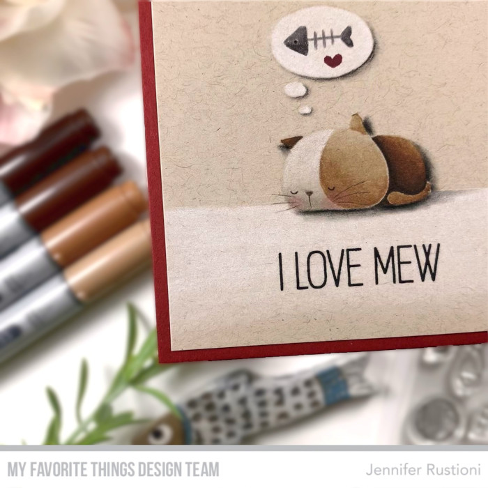 I stamped this little sleepy kitty on a kraft paper with the MFT Natural Hybrid Ink Pad to have a no-line effect. I made the same thing with the speech bubble. I colored the kitty using Copic markers in the shades of brown. I colored the speech bubble with a white pastel pencil and then I stamped the fish bone with the Distress oxide Pumice Stone. I added some details with a black colored pencil and then I realized the shadows using pastel pencils. At last I colored the floor with the white pastel pencil and I stamped the sentiment at the bottom of my card.