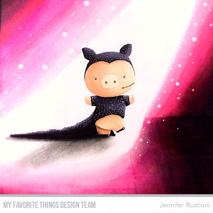 I stamped my subject on the MFT No-line Coloring Card Stock with the MFT Natural Hybrid Ink Pad. I really love this paper, which is perfect to coloring with alcohol markers! I drew Rosita’s dress and then I colored the whole scene with Copic markers. I added some shadows using pastel pencils. At last I added the highlights with a white gel pen.