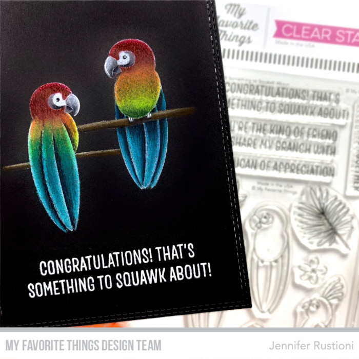 I die cut the MFT Black Licorice Card stock with the new MFT A2 Double Stitched Rectangle STAX Die-namics. I stamped my parrots with the Distress Ink Picket Fence. I colored them in two steps. At first I used pastel pencils to give a “base of colors”, and then I used Prismacolor pencils to have a more “strong” effect. I drew the branches and then I colored them with Prismacolor pencils. At last I stamped the sentiment at the bottom of my card with the Distress Ink Picket Fence and then I went over it with a white gel pen.