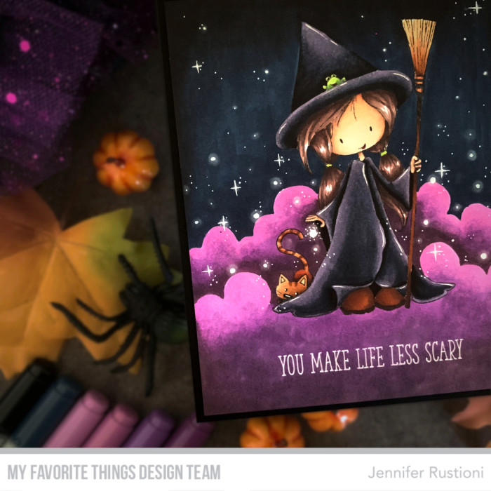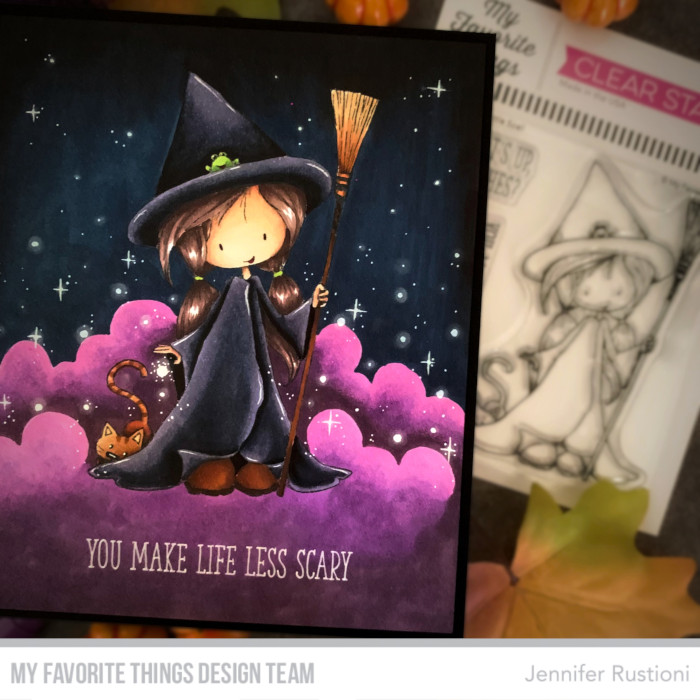 This stamp looks wonderful in this setting. The purple clouds and stars look so good. The little witch’s coloring is super.