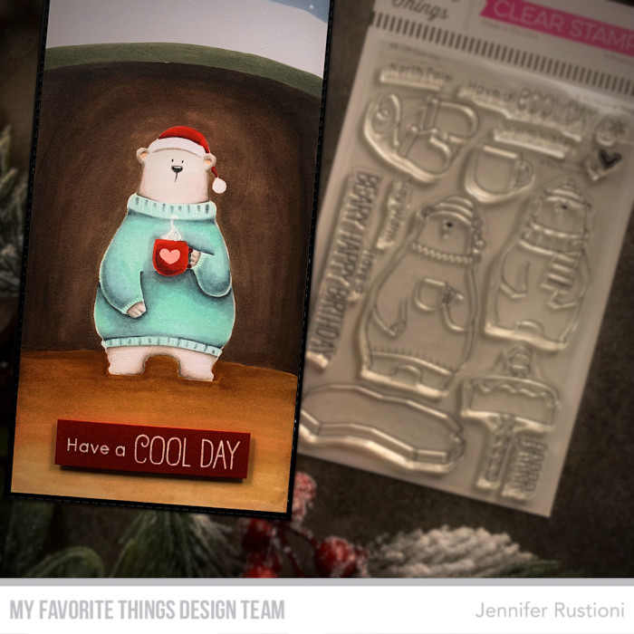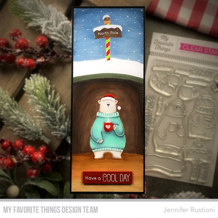 I realized a slimline scene card using this super cute polar bear who’s drinking a cup of hot chocolate in his cave.