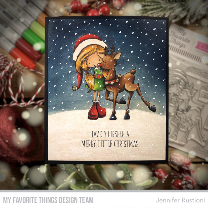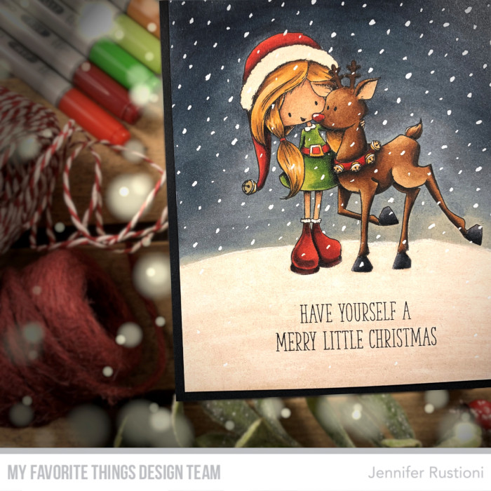 I stamped my subjects with the MFT Extreme Black Ink Pad and then I colored them and the sky with Copic Markers. I realized the snowy ground using a white pastel pencil and then I added the snowflakes with a white gel pen.