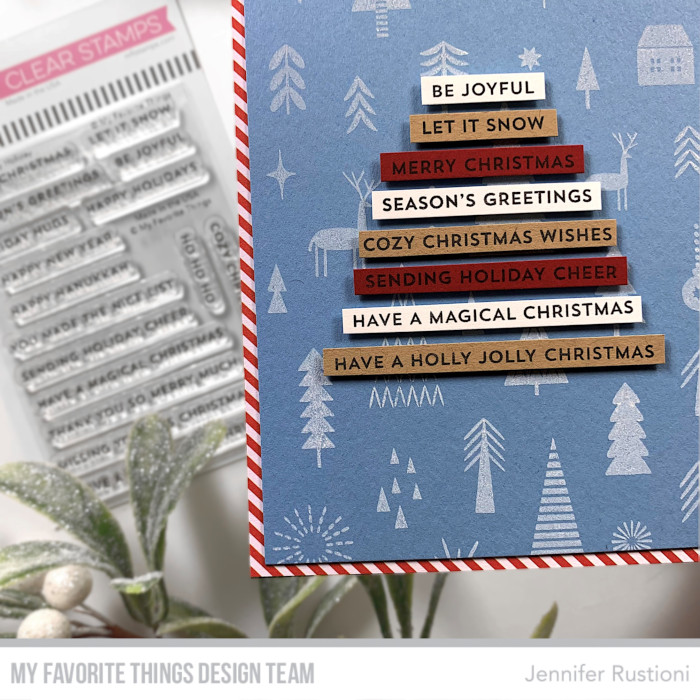 After that I stamped the sentiments using the MFT Itty Bitty Holiday stamp set, on three different colored paper and I trimmed them. I glued the sentiments in the middle of my card, like a Christmas tree.