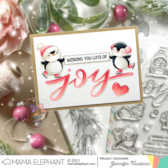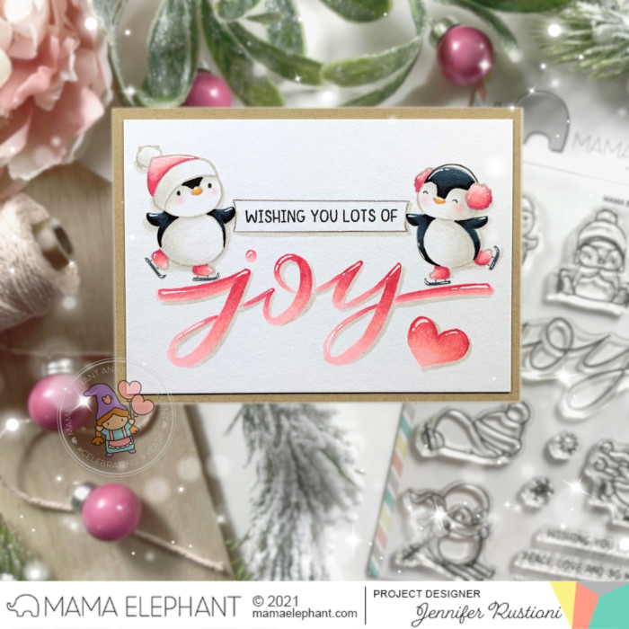 I stamped the word “Joy” with an Hybrid No-line Ink. I colored it as a false brush lettering with the Spectrum Noir Illustrator Markers in the shades of pink. After that, I stamped the penguins with the same ink and I colored them using again the Illustrator Markers. I added a light shadow both the writing and the penguins and then I realized the highlights with a white gel pen. At last, I stamped the sentiment with a black ink and I drew a banner around it.