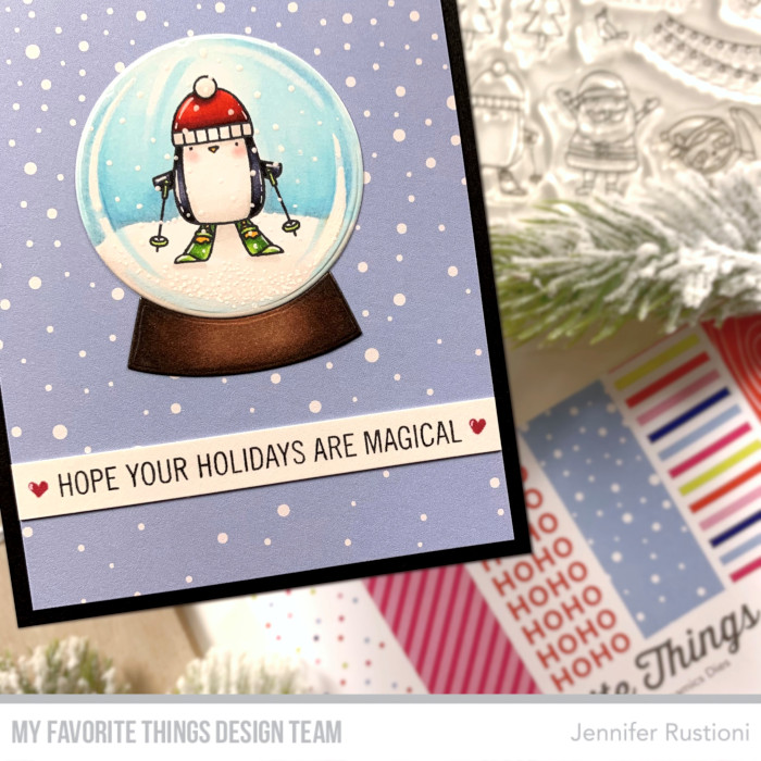 I die cut the circle of the snow globe and its base using the MFT Snow Globe Die-namics. I stamped the penguin from the MFT Snow Globe Singles stamp set, using the MFT Extreme Black Hybrid Ink. I colored the penguin and the whole snow globe with Copic markers. I realized the snowflakes and the highlights with a white gel pen. I trimmed a piece of a patterned paper from the MFT Holly Jolly Paper Pad and I used it as the base of my card. At last, I added a banner with the sentiment at the bottom of my card.