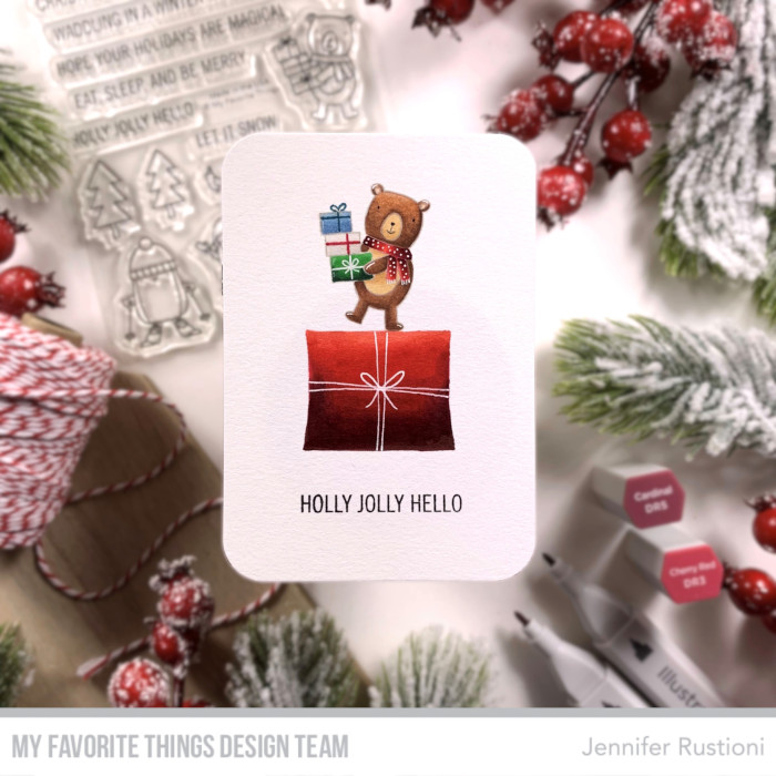 I stamped thil little cute bear with the Distress Oxide Pumice Stone to have a no-line effect. I drew a big package gift under him and then colored the whole card using Spectrum Noir Illustrator Markers. I added some details with a white gel pen.
