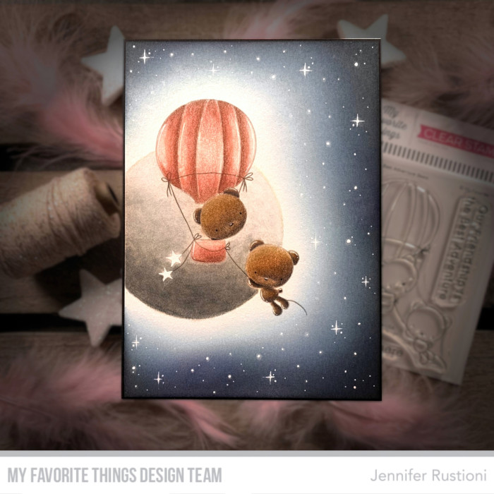 I created a scene card using the super sweet MFT Best Adventures Bears stamp set. I stamped my subject with the Distress Oxide Pumice Stone to have a no-line effect. I colored the bears, the hot air balloon and the moon with the Prismacolor pencils. I realized the sky with Distress Ink in the shades of blue. I added the stars and the highlights using a white gel pen.