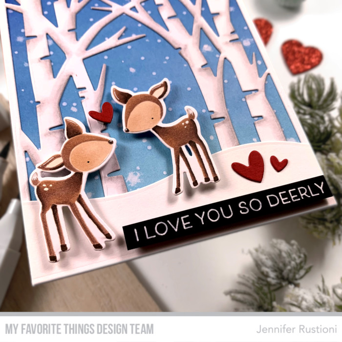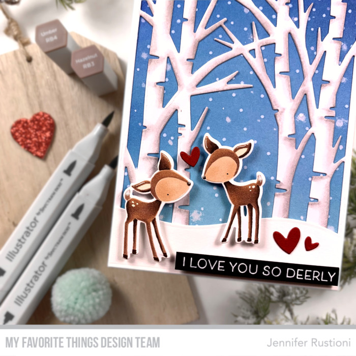I used these super cute deer from the MFT Deer, Sweet Friend stamp set. I stamped them with the MFT Natural Hybrid Ink Pad to have a no-line effect. I colored them with Spectrum Noir Illustrator Markers and then die cut them with the coordinate MFT Deer, Sweet Friend Die-namics.