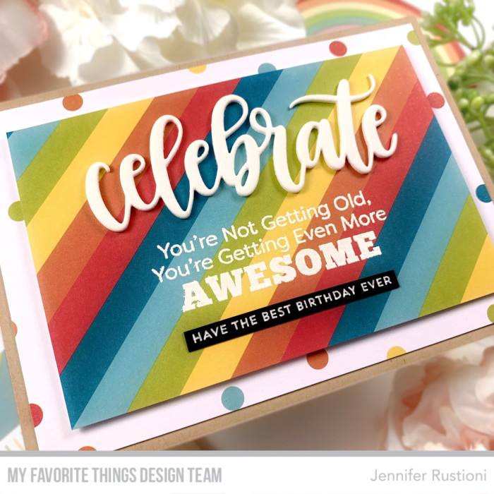 I used the beautiful MFT Time to Celebrate Paper Pad. I trimmed a piece of the rainbow stripes pattern paper and I used it as the main backdrop. I embossed a sentiment from the MFT Celebrate Everything stamp set with a white embossing powder. I die cut the word “celebrate” using the MFT Celebrate Die-namics and put it on the top of my card. I added a small black banner with a secondary sentiment using the MFT Itty Bitty Celebrations stamp set.