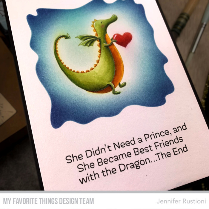 I matched the Dragon with a heart form the MFT Begging To See You Soon stamp set and stamped them with the MFT Natural Hybrid Ink Pad to have a no-line effect. I watercolored them with Distress Inks and then added the shadows with colored pencils.