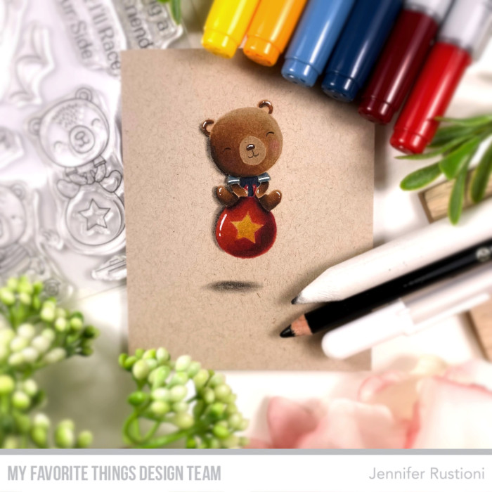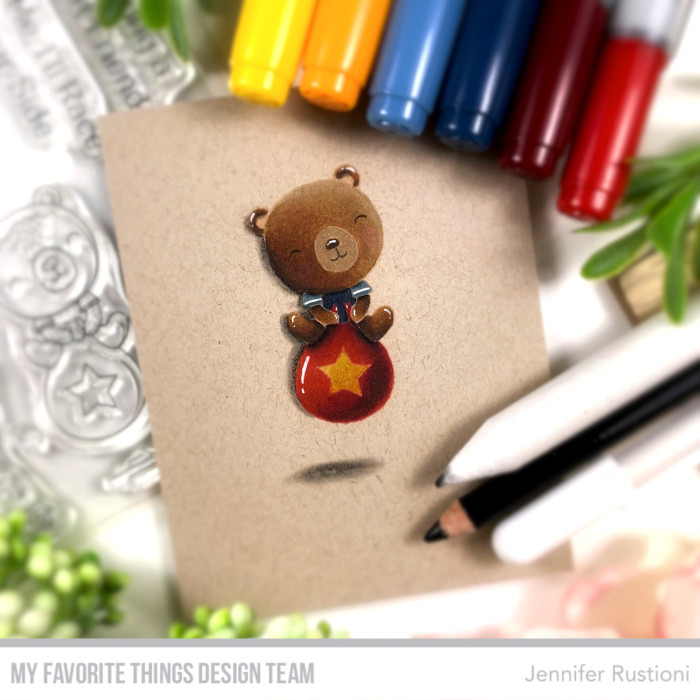 I stamped my subject on a kraft card stock with the MFT Natural Hybrid Ink Pad to have a no-line effect. I colored it with Copic markers and added the highlights with a white gel pen.