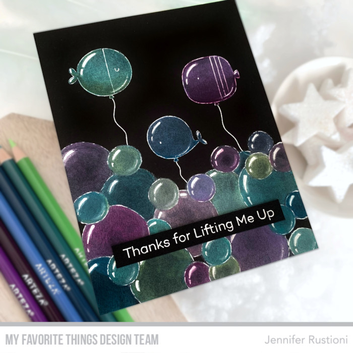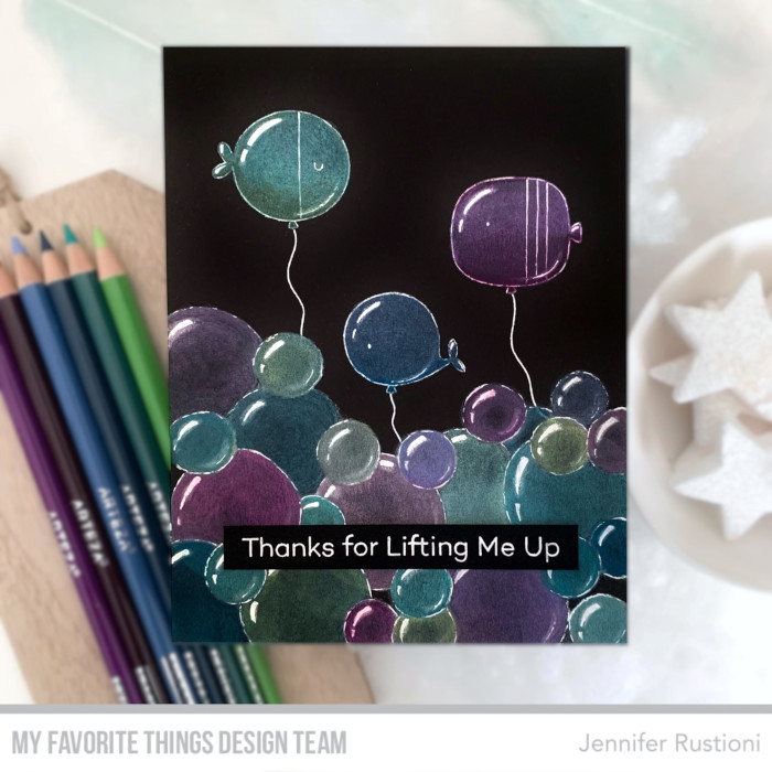 I chose to create a card on the MFT Black Licorice Card Stock. I started stamping the balloons with the Distress Ink Picket Fence. After that I realized the bases of the bubbles using again the Distress Ink Picket Fence blended using the regular and the small blending tool.