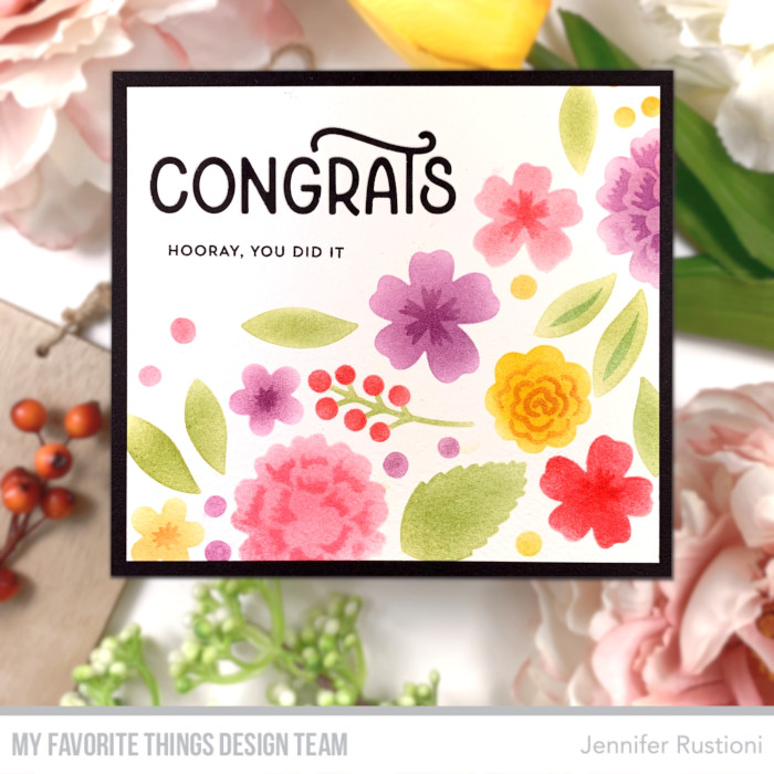 For the Release Day I realized a delicate floral card featuring the new amazing MFT Flower Bouquet Builder Stencil and the MFT Stylish Congrats Die-namics.