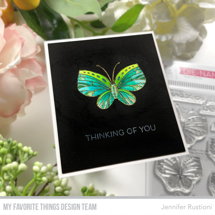 I gold heat embossed the butterfly in the middle of a white watercolor card stock. I colored it using watercolor shimmer powders in the shades of green and blue.