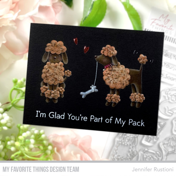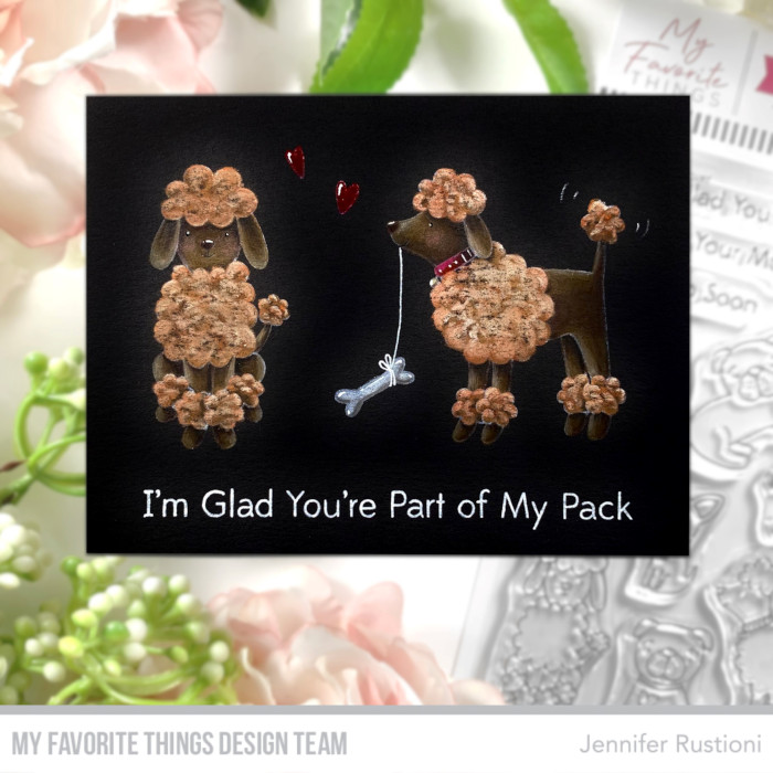 I stamped the two poodles on the MFT Black Licorice Card Stock with the Distress Ink Picket Fence. I chose to work on a black paper to give more effect to the fur.