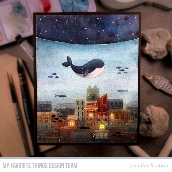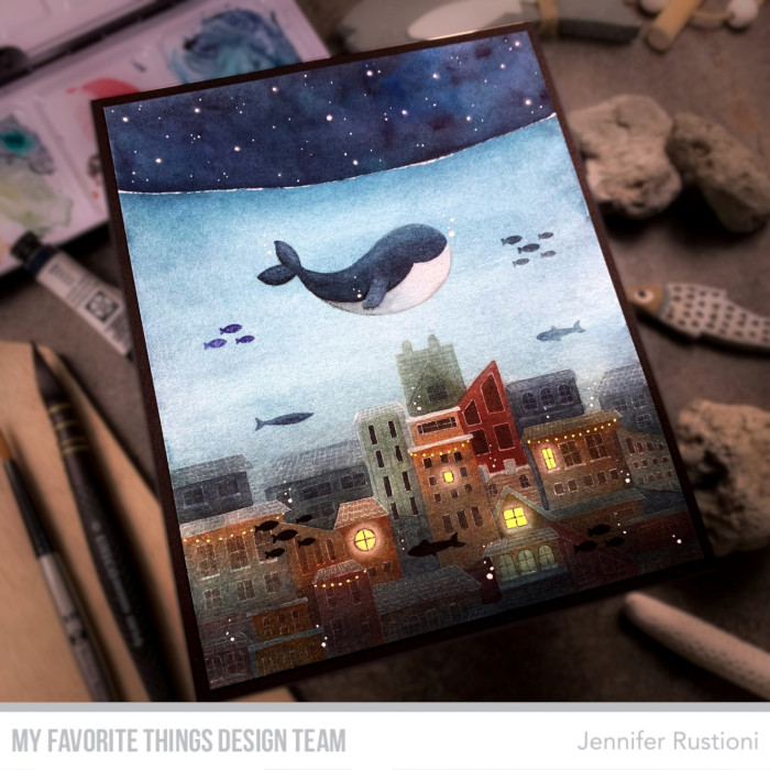 I started stamping the houses and the whale on a watercolor paper with the Distress Oxide Pumice Stone to have a no-line effect. I colored the whole scene using the Daniel Smith Extra-fine Watercolors.