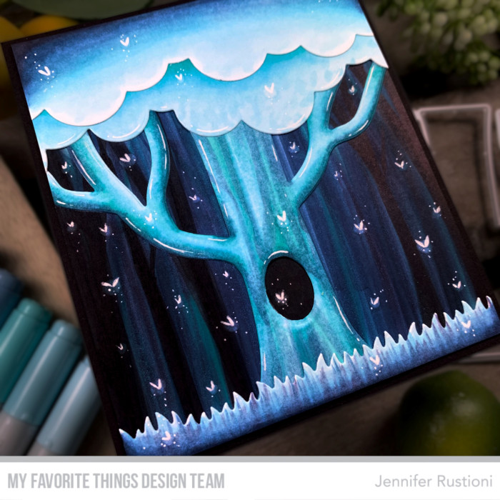 I used the MFT No-line Coloring Card Stock and die cut the tree coloring it with Copic Markers in the shades of light blue. After that I die cut the grass using the MFT Mini Slimline OTB Grassy Hills Die-namics and colored it in the shades of blue-violet.