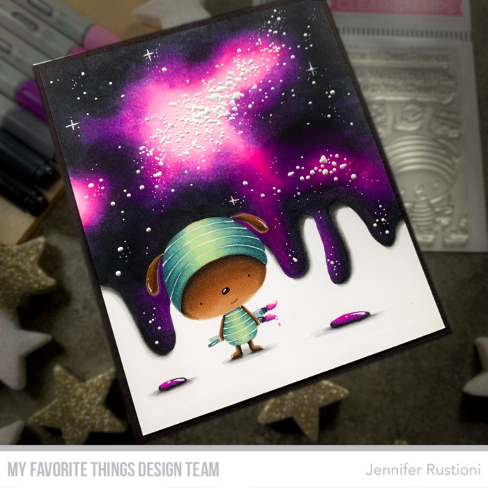 For my Release Day project I had so much fun to create a scene card with this super sweet critter from the MFT We’re the Picture of Best Friends Stamp Set! I figured it painting a violet galaxy with its brushes!