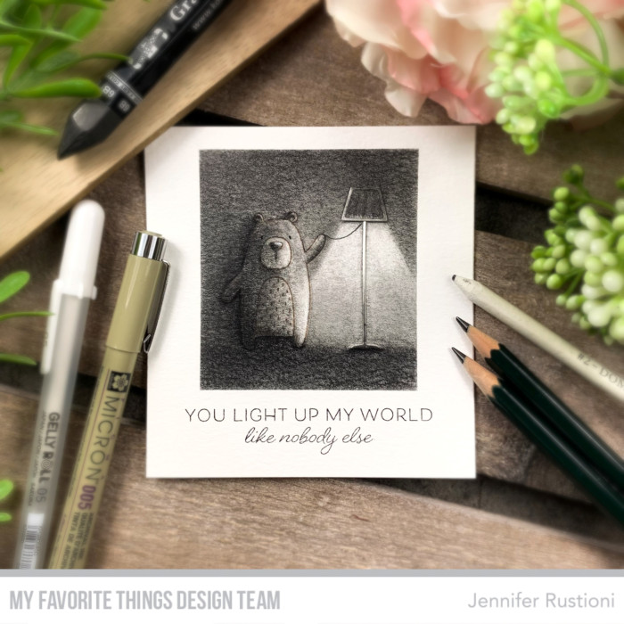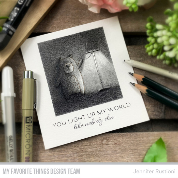 Today I realized a black and white card using the lamp from the MFT Fundamental Furnishings Die-namics and the bear from the MFT Favorite Friends Stamp Set.