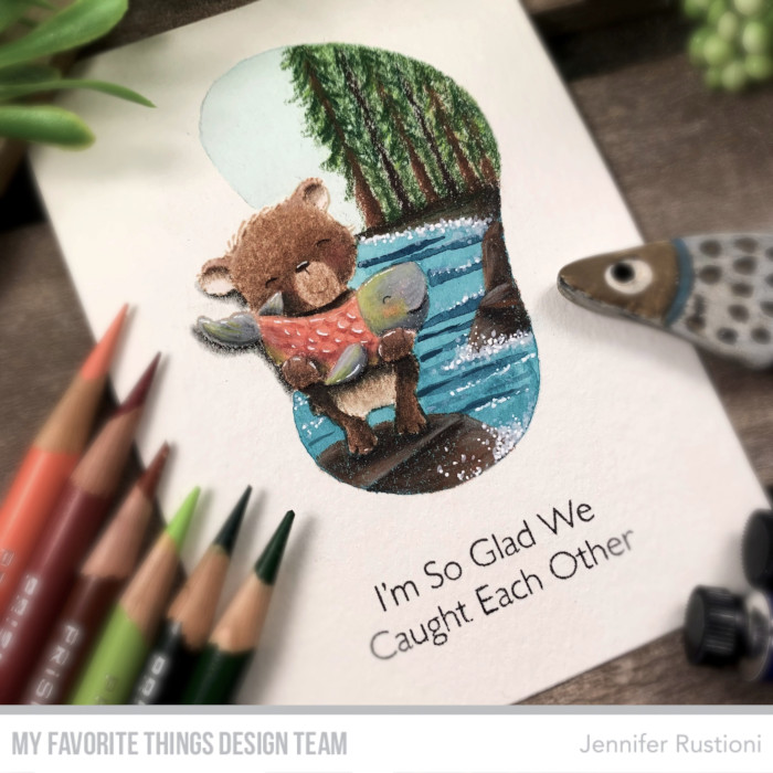 I used the new MFT Pastures, Ponds & Pools Stencil to create a guide for the background. I stamped the bear with the fish using a light brown ink to have a delicate effect. I chose to stamp it half in and half out of the outline to have a more interesting effect.