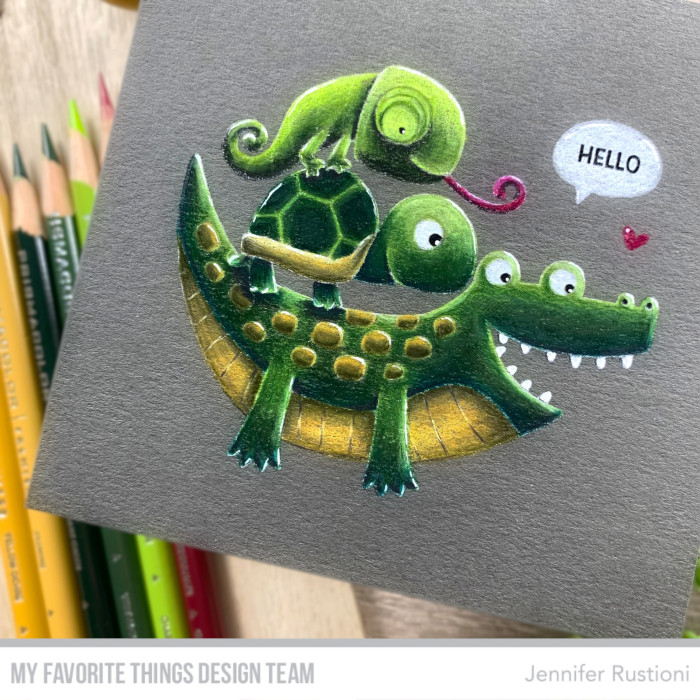 I stamped the critters and the speech bubble with the Distress Ink Picket Fence. I colored them with Prismacolor Premier Colored Pencils in the shades of green. After that I added the highlights and the details using a white gel pen.