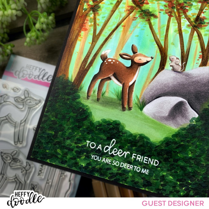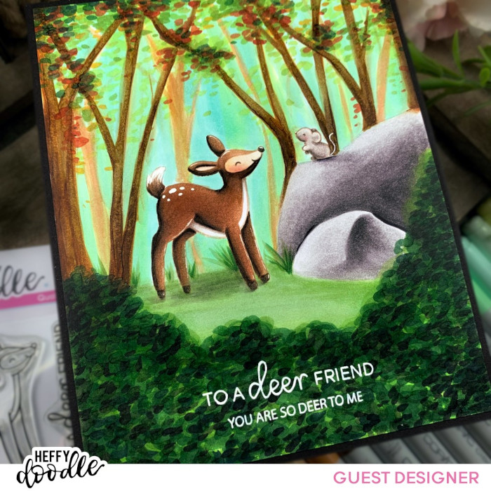 Today I had so much fun creating a scene card, featuring the amazing Heffy Doodle Deer To Me Clear Stamp Set! I’m in love with this Stamp Set! These little fawns are so cute and sweet!