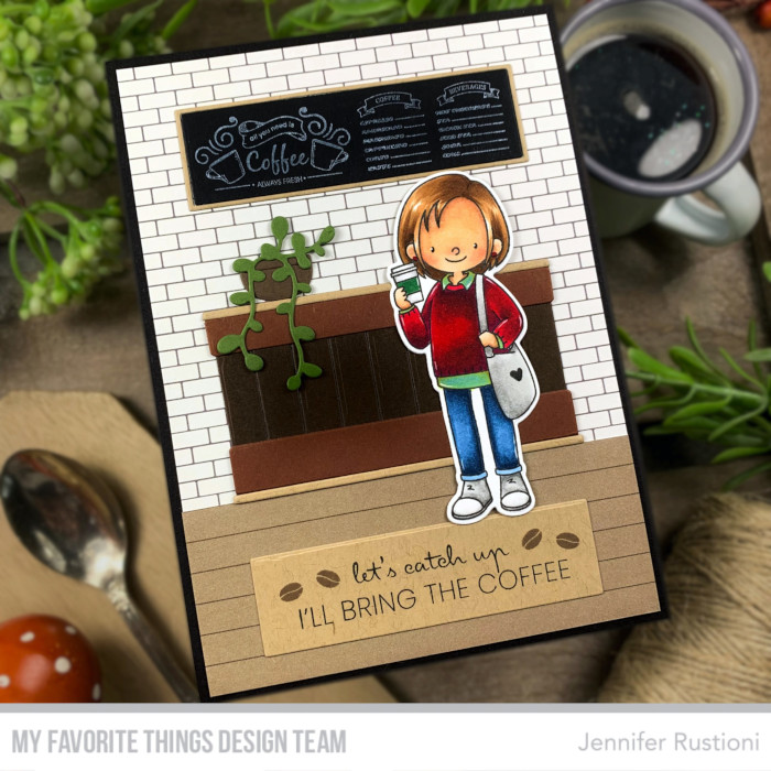 I die cut the bar counter, the plant and the borad using the MFT Bistro Basics, Pots and Plants and Make a Sign Die-namics. I stamped the writing from the MFT Coffee Shop Stamp Set on the board using the Distress Ink Picket Fence.
