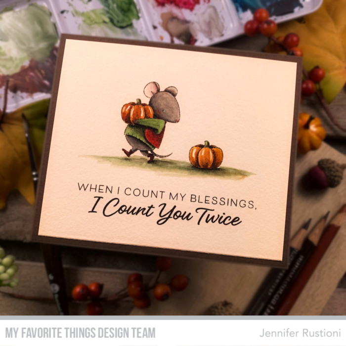 I stamped the mice and the pumpkin on a light cream paper with a brown ink, to have a soft effect. I colored them with watercolors and then added depth with colored pencils.