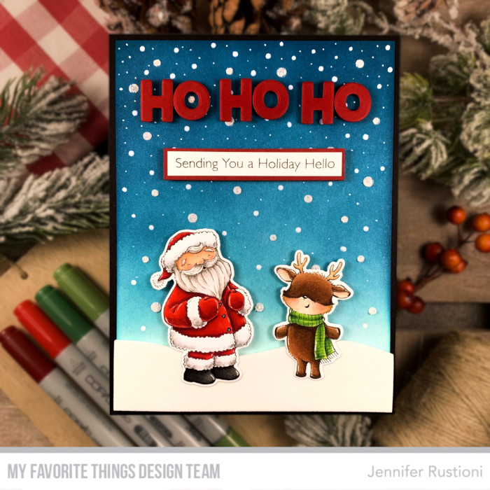 I die cut the writing “Ho Ho Ho” with the MFT MSTN Hip Hip Yay Alphabet Die-namics and the snowy floor with the MFT Mini Slimline Outside the Box Snow Drifts Die-namics.