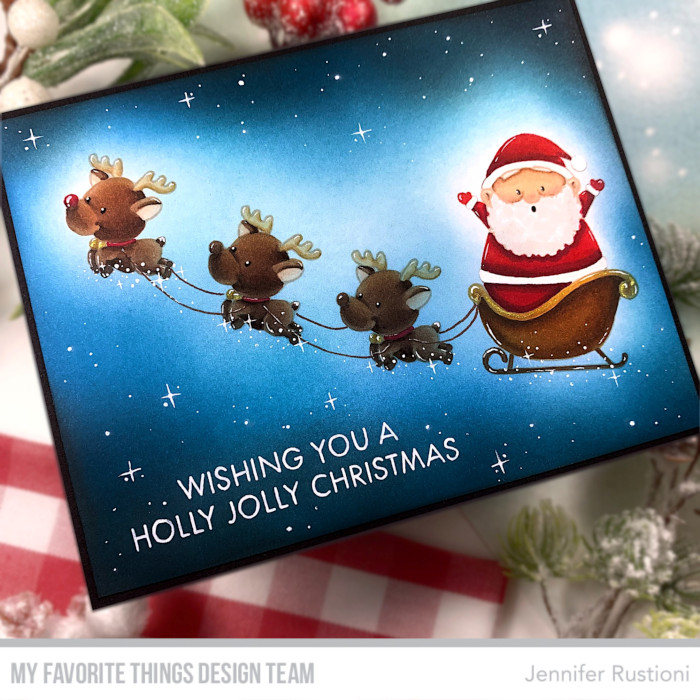 I stamped Santa, the sleight and the reindeer on the MFT No-line Coloring Card Stock with the Memento Desert Sand Ink Pad to have a no-line effect. I colored them with Copic Markers and added some highlights with a white gel pen.