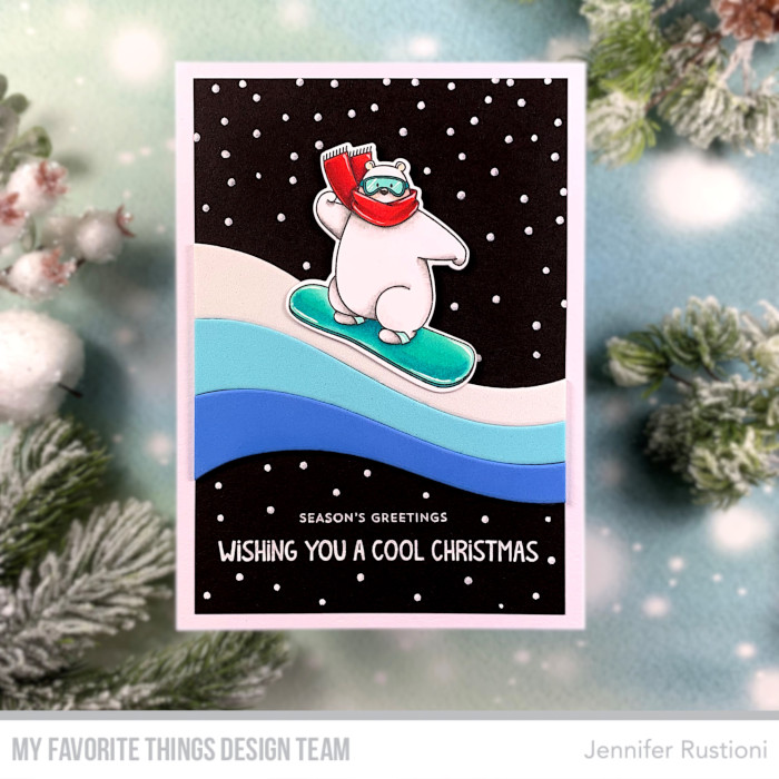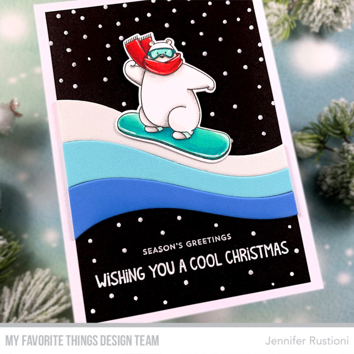 I assembled my card on a black cardstock and then added the snowflakes using a white gel pen. At last I matched two sentiments from the MFT MSTN Cool Christmas Greetings and MFT Itty Bitty Holiday Stamp Sets.