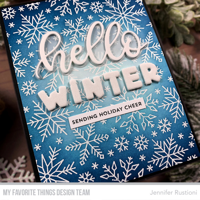 For my Release Day project I created a card a bit different from my usual, featuring the new beautiful MFT Snowflakes Flurry Background Rubber Stamp!