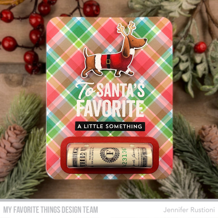 I started die cutting the base of my card with the MFT Money Card Die-namics using a sheet from the MFT Cheerful Plaid Paper Pad. I used the same die cut set to create the hole for the MFT Lip Balm Puoches, inside of which I rolled the money.