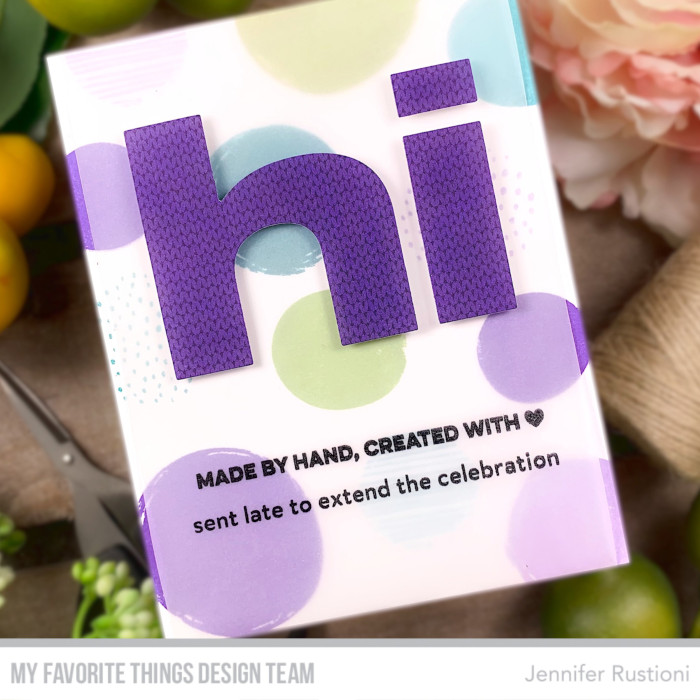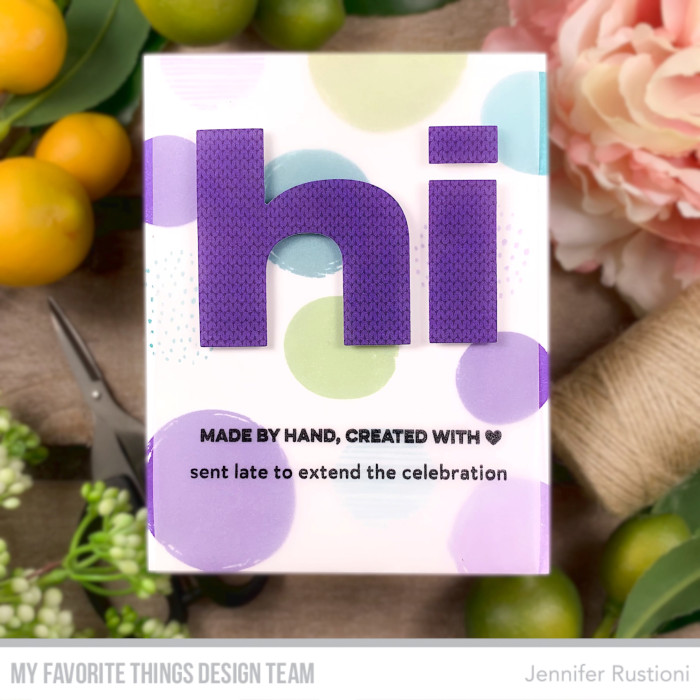 I die cut the word “Hi” using the new MFT A Very Big Hi Die-namics with a paper sheet from the MFT Keep Me In Stitches Pattern Paper. After that I trimmed a piece of vellum and glued it over the background. I chose two sentiments from the MFT Hand Stamped Original Stamp Set and stamped them on it with the Jet Black Stazon Ink Pad. At last, I added the word “Hi” to my card.