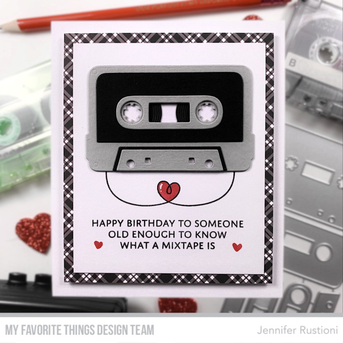 I die cut the various parts of the cassette tape using the MFT Black Licorice and Cement Gray Card Stock and then assembled it. I glued it on a white card stock and then stamped the tape using the new MFT MSTN Mixtape Sentiments Stamp Set and then colored the heart with a red Copic marker.