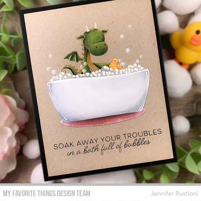 Today I took a bath in a tub full of bubbles with the new MFT Bubble Bath Die-namics! I matched it with a dragon from the MFT BB Magical Dragons Stamp Set. I really enjoyed the idea of a dragon taking a bath with a rubber ducky, lol!