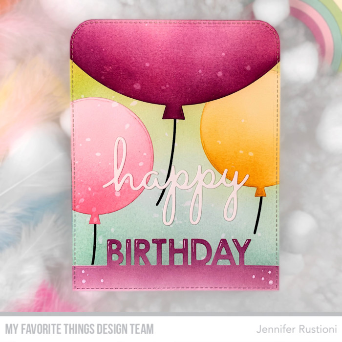 I die cut the balloons and blending them with Distress Ink in the shades of pink and yellow. I blended the background using Distress Ink in the shades of blue and green. I glued the balloons on the backdrop and added some water splashes. At this point, I die cut the background.