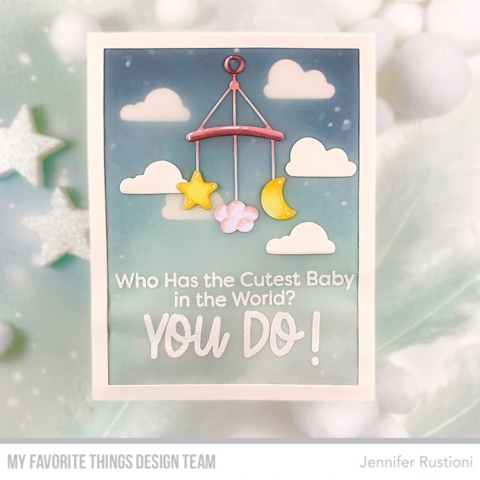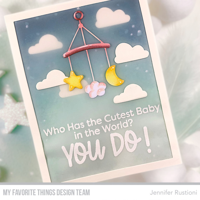 I realized the background blending some Distress Ink Salvaged Patina and Uncharted Mariner. I die cut some clouds from the MFT YUZU Hunny Bunny Die-namics and added on my background. I trimmed a piece of vellum paper and white embossed a sentiment on it, from the new MFT Oh, Baby! Stamp Set. After that, I put it on my backdrop to give a more soft effect.